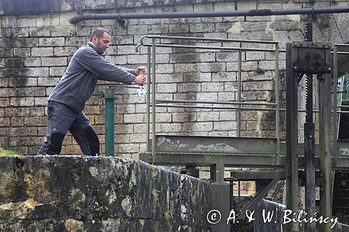 Czasami kanał prowadzący do śluzy jest bardzo wąski i należy przed nim na chwilę przytulić się do brzegu, żeby wypuścić wychodzącą jednostkę, tak jak na tym filmie: