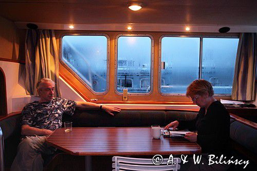 Barka turystyczna Penichette 1165 FB to najwygodniejsza jednostka, jaką dotychczas pływaliśmy. Co prawda w jednej z trzech dwuosobowych kabin było piętrowe łóżko, a rufowe sypialnie miały wspólną łązienkę i ubikację (osobne pomieszczenia), ale te drobne niedogodności równoważone były bardzo wygodnym rozkładem wnętrza i możliwością wyjścia na rufę oraz “mostek” aż trzema drzwiami. Barka ma świetne możliwości manewrowe, wspomagane w razie potrzeby przez dziobowy ster strumieniowy. Ważnym jest zdublowanie stanowiska sternika. Podczas deszczu można prowadzić łódź z wnętrza, a tylko manewry portowe czy wejścia do śluz albo przejścia pod wyjątkowo wąskimi mostami wykonywać z “dachu”, gdzie ster umieszczony jest w osi jachtu, pozwalając na dużą precyzję nawigowania. Pod pokładem, patrząc od dziobu, znajduje się obszerna kabina z własną łazienką (wc, umywalka,prysznic), dalej duży kambuz z lodówką, wieloma szafkami, zlewem i kuchenką. Po kilku schodkach wchodzi się do położonego na trochę wyższym poziomie salonu z doskonałym widokiem na zewnątrz, sporym stołem, siedziskami oraz położonym na prawej burcie stanowiskiem sternika. Tuż za nim znajdują się przesuwane drzwi wychodzące na półpokład oraz schodki skierowane ku górze wiodące przez suwklapę na mostek. W dół z kolei prowadzą schodki do kabin rufowych. W jednej z nich (tej z piętrowym łóżkiem) znajdują się kolejne przesuwne drzwi wychodzące nisko na rufę, skąd po drabince można dostać się łatwo na wysoko położony pokład górny, ze stanowiskiem sternika oraz stolikiem i ławami. Ku dziobowi rozciąga się “pokład słoneczny”, a z przodu jachtu kolejne miejsce do kontemplacji – siedzisko ze stolikiem. Burty, jak we wszystkich chyba “peniszetkach” chronione są gumowymi listwami oraz odbijaczami. Penichette 1165 FB może pływać do 7 osób (wtedy jedna śpi w salonie obok stołu), ale wygodnie 6. Cztery godziny żeglugi dziennie ładuje akumulatory wystarczająco, by można było używać prądu do woli, w tym wydajnego ogrzewania, pomp wodnych, lodówki, komputerów itd. Jedynym mankamentem naszej łódki było zainstalowanie tylko jednego gniazda 230 V, co w czasach, gdy każdy załogant ma komórkę, laptopa, MP-ileś-tam, a niektórzy też golarkę, suszarkę do włosów, elektryczną szczoteczkę do zębów itd, jest nieporozumieniem. Wniosek? Należy zabrać ze sobą rozgałęziacz. Zbiornik nieczystości z toalet zapełnia się mniej więcej po 3-4 dniach, o czym informują odpowiednie diodki. Co taki też czas warto zadbać o napełnienie zbiorników na wodę. Jacht wyposażony jest w silnik diesla o mocy 50 KM, “pijący” około 4.3 litra ropy na godzinę. Długość jednostki wynosi 11.6 m, szerokość 3.85 m, wysokość ponad wodą 2.9 m, a zanurzenie 0.85 m.
